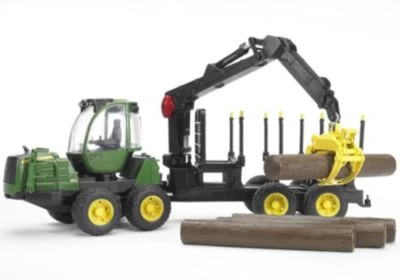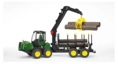 Der 4-achsige Rückezug von John Deere kann die geschlagenen Baumstämme durch unwegsames Gelände transportieren und seine Fracht selbstständig be- und entladen. Die an sich schon sehr gute