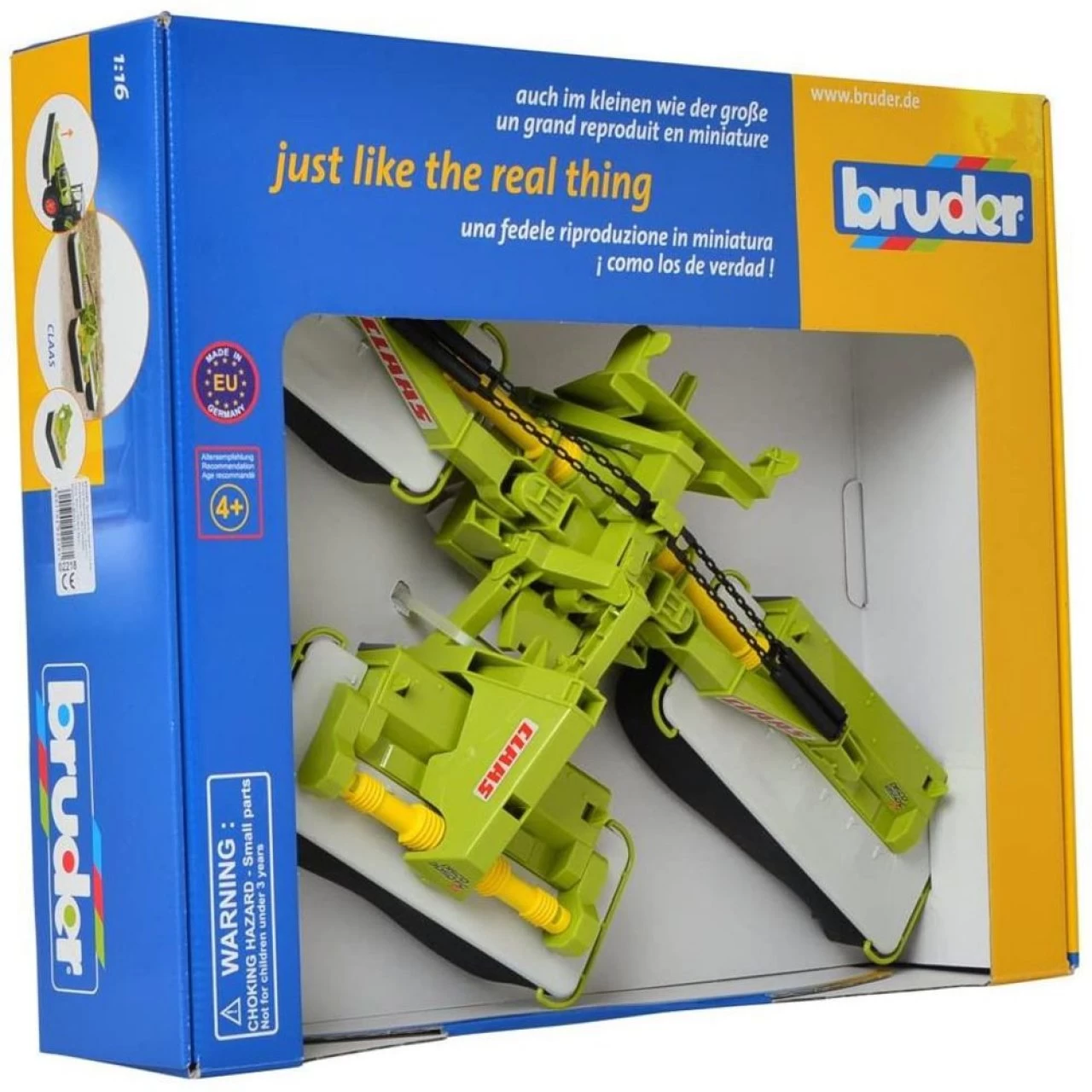 Landwirte, die sich in erster Linie der Nutztierhaltung verschrieben haben benötigen bei der Futterernte robuste Arbeitsgeräte, die tagtäglich Höchstleistungen vollbringen. Zu den weltweit führenden Systemanbietern in Sachen Futterernte gehört die Firma CLAAS, deren Produkte zuverlässig die härtesten Herausforderungen packen und im Dauereinsatz aufgrund ihrer Qualität nicht in die Knie gehen – Eigenschaften, die sich im Kleinen in den Spielfahrzeugen der Firma BRUDER wiederfinden. Was liegt da näher als ein solches imposantes Großflächen-Mähwerk in ein ebenso imposantes Spielzeug umzusetzen, das durch die zahlreichen realistischen Funktionen und die Detailtreue überzeugt. So sind alle 3 Mähwerke pendelnd gelagert und können damit Bodenunebenheiten ausgleichen. Das Mähwerk verfügt über rotierende Aufbereiterwellen. Das Dreifach-Mähwerk ist teilbar für den Front- und Seiteneinsatz am Traktor mit der Vorrichtung, dass die Seitenmähwerke für den Transport nach oben geklappt werden können. Der Einsatz am Claas Jaguar erfolgt komplett frontseitig mit Hilfe eines beiliegenden Adapters; für den Straßentransport lassen sich die Mähwerke nach vorne schwenken und anheben. Mit diesem landwirtschaftlichen Arbeitsgerät beweist BRUDER wieder einmal die hohe technische Raffinesse seiner Produkte, die dem spielenden Kind die Funktionsweisen der großen Vorbilds-Brüder faszinierend vor Augen führt.