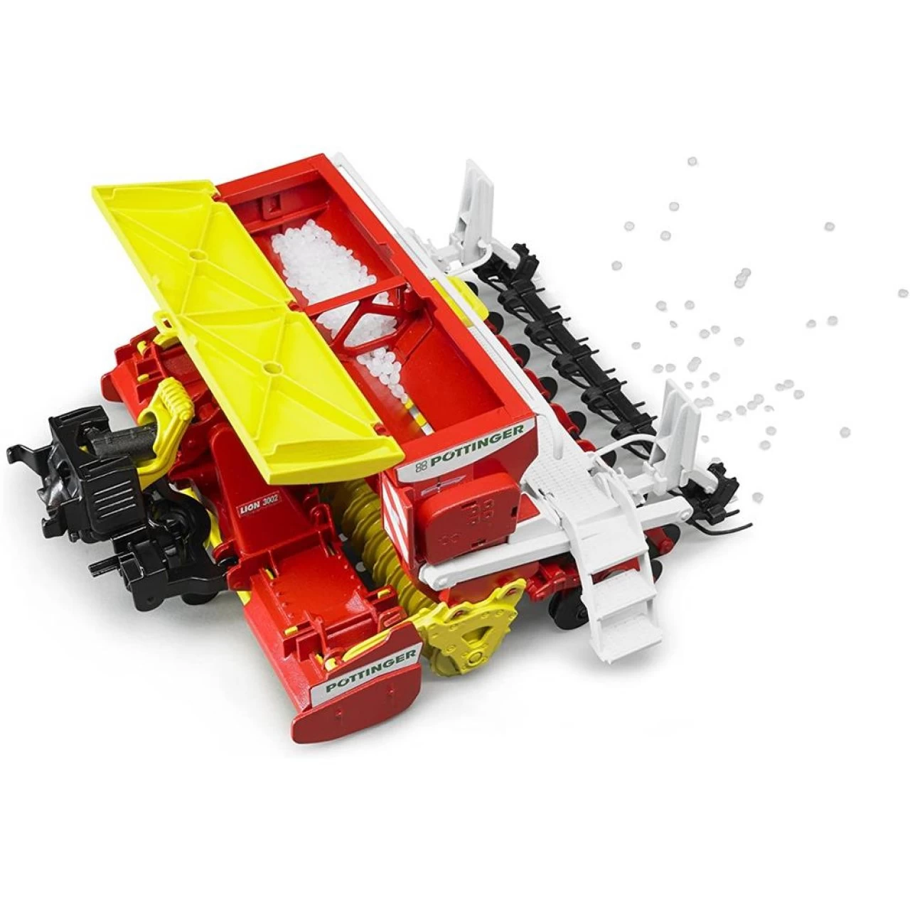 Die Pöttinger Vitasem 302ADD Kreiselegge-Sämaschine dient der landwirtschaftlichen Bodenbearbeitung und beherrscht eine besonders exakte und schnelle Saatgutdosierung. Präzises Säen und erfolgreiches Ernten sind das Motto der von Pöttinger hergestellten Kombinationseinheit. Das Modell im Maßstab 1:16, ist mit dem BRUDER spezifischen Adapter ausgestattet, der einen Anbau der Kreiselegge-Sämaschine an sämtliche Traktoren aus dem Sortiment erlaubt. Durch die integrierte Hubmechanik lässt sich sowohl die Transport- als auch die Arbeitsstellung durch das Heben und Senken der Einheit originalgetreu nachspielen. Durch Absenken der sich drehenden Andruckwalze, kann die Bearbeitung des Bodens stattfinden. Die zusätzlich erhältlichen Spielfiguren von BRUDER können über die ausklappbare Treppe auf die Kombination steigen, um z.B. den Saatguttank zu öffnen. Nachdem dieser befüllt, die Kombination an den Traktor angehängt und der Auslassdosierschieber geöffnet wurde, kann die Arbeit beginnen. Zahlreiche Details unterstützen die optische Wirkung und machen das Spielen somit noch realistischer. Das deutsche Familienunternehmen BRUDER Spielwaren zeichnet sich seit der Gründung im Jahre 1926 durch innovative Produkte „Made in Germany“, der Liebe zum Detail und dem Erfüllen von Kinderträumen aus. Mit Einführung der Kunststoffproduktion wurde der Weg zum heutigen weltweiten Erfolg der Marke BRUDER geebnet. BRUDER verwandelt die erlebte reale Welt in eine originalgetreue Kinderspielwelt. Mit dem pädagogischen wertvollen Prinzip können Kinder das Gesehene aufbereiten und werden spielerisch an die verschiedensten Themen, wie den Straßenbau, die Landwirtschaft oder an Rettungseinsätze herangeführt. Dabei überzeugt BRUDER durch die hohe Qualität und vielseitige Funktionalität seiner Produkte. Die Slogans „auch im Kleinen wie der Große“ beziehungsweise „Just like the real thing“ spiegeln das Leitbild der Firmenphilosophie wieder. Die geschaffenen Welten lassen sich durch die maßstabsgetreuen Figuren der B-World Serie (BRUDER Welt) bevölkern und bieten durch den aktiven Einsatz auf Feldern und Baustellen ein grenzenloses Spielvergnügen für Jung und Alt.