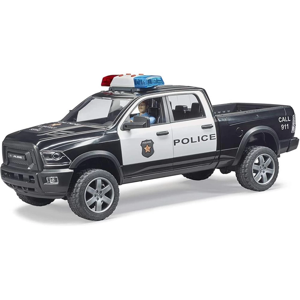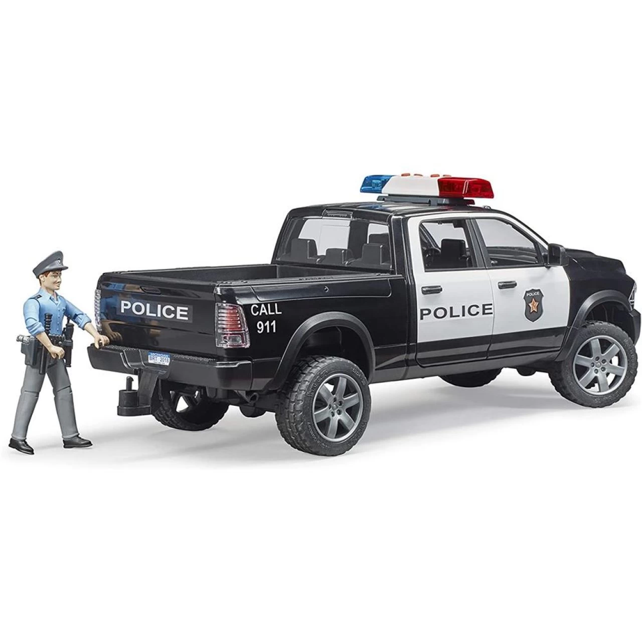 Die BRUDER Polizei erhält Verstärkung. Um auch abseits der Stadt, im schwer zugänglichem Gelände aktiv sein zu können, kommt zu den BRUDER Einsatzkräften ein 4×4 Polizei Pickup Truck hinzu. Das Einsatzfahrzeug ist auf Basis des bekannten RAM 2500 aufgebaut und besitzt, wie vor allem in den USA üblich, eine attraktive auffällige Farbgestaltung und ein auf dem Dach montiertes Light & Sound Modul. Das Spielzeug ist wie sein großes Vorbild mit der 4-türigen Kabine, der CREW Cab, ausgestattet. Alle Türen sind zum Öffnen und bieten 4 bworld Figuren Platz. Für Fahrkomfort und Geländegängigkeit ist dieses Modell im Maßstab 1:16 mit gefederten Achsen ausgestattet, wobei die Vorderachse mit der enthaltenen Lenkradverlängerung lenkbar ist. Für den Transport im Spielbetrieb kann die Heckklappe geöffnet werden. Der enthaltene Polizist ist bestens ausgerüstet und auf eine Vielzahl möglicher Einsätze vorbereitet. Aus dem breiten Angebot an Einsatzfahrzeugen und Figuren passen besonders gut die bworld Polizeistation (Art.-Nr. 62730) sowie der Jeep Rubicon Unlimited als Polizeifahrzeug (Art.-Nr. 02526). Das deutsche Familienunternehmen BRUDER Spielwaren zeichnet sich seit der Gründung im Jahre 1926 durch innovative Produkte „Made in Germany“, der Liebe zum Detail und dem Erfüllen von Kinderträumen aus. Mit Einführung der Kunststoffproduktion wurde der Weg zum heutigen weltweiten Erfolg der Marke Bruder geebnet. Bruder verwandelt die erlebte reale Welt in eine originalgetreue Kinderspielwelt. Mit dem pädagogischen wertvollen Prinzip können Kinder das gesehene aufbereiten und werden spielerisch an die verschiedensten Themen, wie den Straßenbau, die Landwirtschaft oder an Rettungseinsätze herangeführt. Dabei überzeugt Bruder durch die hohe Qualität und vielseitige Funktionalität seiner Produkte. Die Slogans „auch im Kleinen wie der Große“ beziehungsweise „Just like the real Thing“ spiegeln das Leitbild der Firmenphilosophie wieder. Die geschaffenen Welten lassen sich durch die maßstabsgerechten Figuren der B-World Serie (Bruder Welt) bevölkern und bieten durch den aktiven Einsatz auf Feldern und Baustellen ein grenzenloses Spielvergnügen für Jung und Alt.