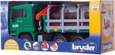 Im Lieferumfang sind 3 Baumstämme enthalten. Profilreifen runden das Bild ab. Zur Spielergänzung kann der MAN Holztransport-LKW mit den Zubehör-Kategorien H und M ausgestattet werden.