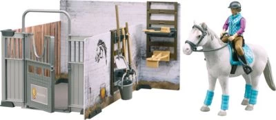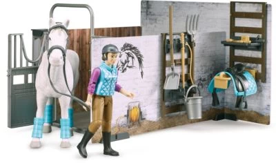 Mit den neuen Themensets taucht man noch tiefer in die Bruderwelt ein. Bedruckte Wandelemente mit einfach zu montierenden Stellfüßen bilden nun den Raum für noch mehr Realität beim Spielen und mit dem neuen Regalsystem lässt sich auch mit den Elementen interagieren.Pferde und der Reitsport stehen, vor allem bei Mädchen, sehr hoch im Kurs. Dieses schöne Hobby kann mit all seinen Tätigkeiten, im neuen bworld Pferdestall nachgespielt werden. Ausreiten, Füttern, Pflegen und den Stall reinigen, für diese spannenden Tätigkeiten bietet der bworld Pferdestall dank des umfangreichen Zubehörs und seiner realistischen Darstellung den idealen Rahmen. Der bworld Pferdestall ist auf einfachste Art und Weise mit den anderen bworld Themensets kombinierbar.Der bworld Pferdestall ist die ideale Erweiterung für das umfangreiche Reit- und Pferde Sortiment. Besonders gut passen der MB Sprinter Tiertransporter (Art.-Nr. 02533), der RAM Power Wagon mit Pferdeanhänger (Art.-Nr. 02501) und das bworld Reitset (Art.-Nr.62505).