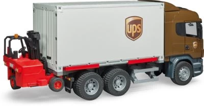Die Scania R-Serie ist ein Synonym für Wirtschaftlichkeit und Dynamik. Auch der weltweit operierende Versanddienstleister UPS setzt auf diesen leistungsstarken LKW. Der Containeraufbau der Zugmaschine ist dabei in alle Einzelteile zerlegbar und besitzt Flügeltüren am Heck. Eine weitere herausragende Spielmöglichkeit dieses Fahrzeuges ist die Wechselbrücke, die sich durch Herausziehen und Aufstellen ihrer Stützfüße automatisch vom Fahrzeug löst und den Container in die Höhe stellt, wodurch der LKW dann unter der Wechselbrücke herausfahren kann.